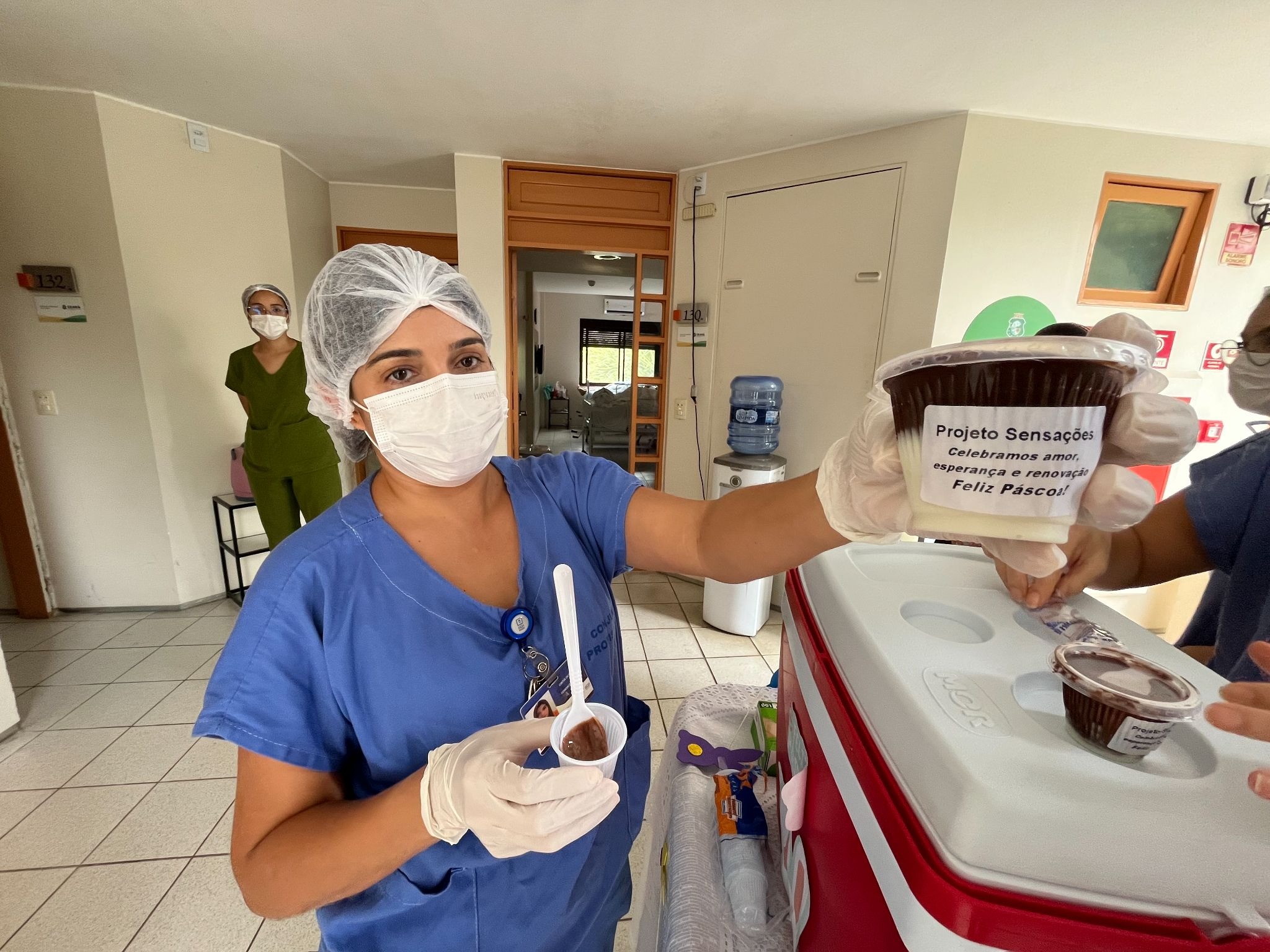 O clima de Páscoa invadiu a Casa de Cuidados do Ceará (CCC), unidade de desospitalização da Secretaria da Saúde do Ceará (Sesa), nesta quarta-feira (1º). A equipe multiprofissional foi até os leitos dos pacientes, levando sobremesa de chocolate ao som de voz e violão. A ação foi realizada pelas nutricionistas e fonoaudiólogas da CCC e tem o intuito de proporcionar às pessoas internadas na unidade momentos de prazer, nostalgia, bem-estar e alegria por meio de memórias associadas à alimentação, por meio do Projeto Sensações.